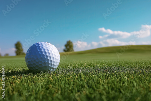 Low‑Angle Close‑Up of Golf Ball on Green with Sky and Negative Space