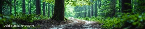 Low-angle view of a tree next to a winding path through a quiet forest