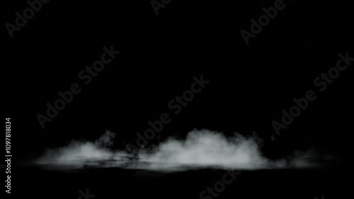 Low-lying fog fills the air above a dark landscape, creating a mysterious ambiance at night near a secluded body of water. scene evokes a sense of intrigue and hidden wonders. 3d render