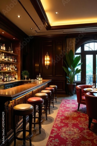 Low-slung bar nestled between opulent dining area and elegant foyer, cigar lounge, gold accents