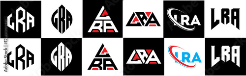 LRA letter logo design in six style. LRA polygon, circle, triangle, hexagon, flat and simple style with black and white color variation letter logo set in one artboard. LRA minimalist and classic logo