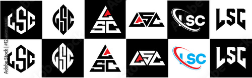 LSC letter logo design in six style. LSC polygon, circle, triangle, hexagon, flat and simple style with black and white color variation letter logo set in one artboard. LSC minimalist and classic logo