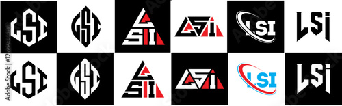 LSI letter logo design in six style. LSI polygon, circle, triangle, hexagon, flat and simple style with black and white color variation letter logo set in one artboard. LSI minimalist and classic logo