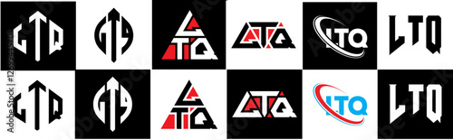 LTQ letter logo design in six style. LTQ polygon, circle, triangle, hexagon, flat and simple style with black and white color variation letter logo set in one artboard. LTQ minimalist and classic logo