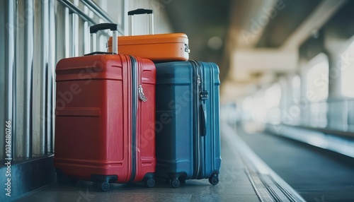 Luggage waiting at the airport terminal with vibrant colors and polished surfaces