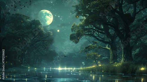 A mesmerizing scene where the moon's luminescence bathes a tranquil forest and peaceful lake, casting a spell of serenity under the starry night sky.