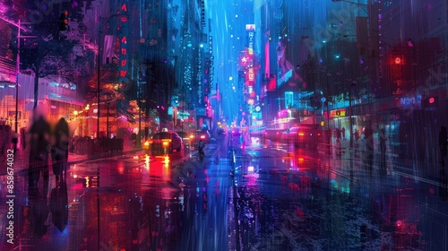 Luminescent neon lights reflecting in rain-soaked city streets at dusk