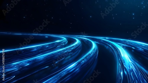 Luminous blue lines speed. Neon color glowing lines background, high-speed light trails effect. Futuristic dynamic motion technology.