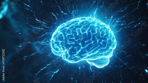 Luminous cerulean brain floating in dark space, surrounded by electric energy. This captivating image evokes sense of wonder and exploration of mind