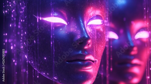 Luminous figures gather under a cascade of lights showcasing mesmerizing masks that embody a surreal ethereal elegance