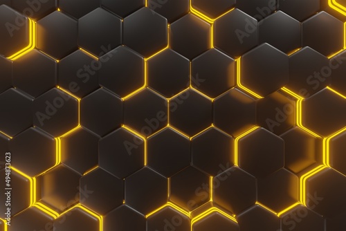 luminous hexagons, black and orange or yellow abstract background made of geometric shapes, color structure made of honeycombs, 3d rendering