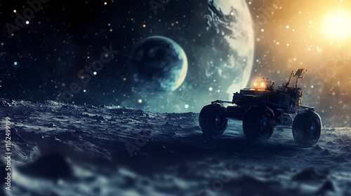 Lunar rover on the surface of the moon against the background of brightly lit earth. Moondust. Illustration