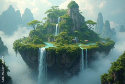 lush floating island in a misty void, covered in exotic flora and waterfalls, surreal, vibrant, ultra-detailed