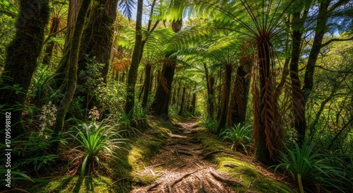 Lush forest path, sunlight filtering through ferns
