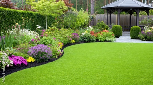 Lush garden with vibrant flowers and a gazebo in a serene setting.