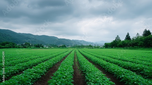 Lush green agricultural field with rows of crops stretching towards distant mountains under a dramatic cloudy sky, showcasing nature's beauty and farming