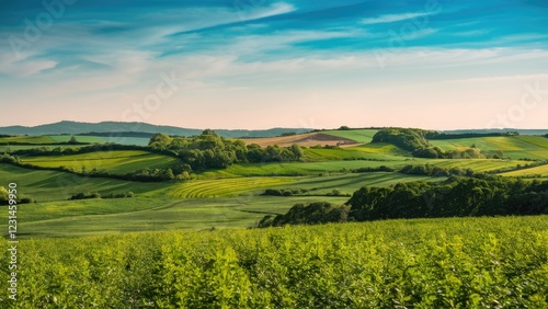 Lush green agricultural fields stretch across the foreground under clear blue skies with rolling hills in the background showcasing vibrant natural beauty