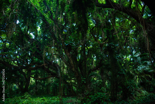 Lush, green beautiful tropical forest in Hawaii. Thick, healthy Rainforest jungle scenic photo