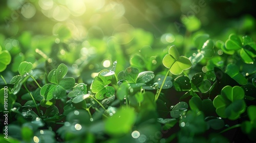 Lush Green Clover Field with Morning Dew in a Dreamy Light, Capturing the Essence of Nature's Beauty in a Serene Environment