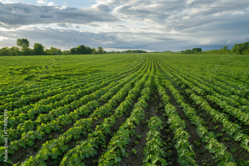 Lush Green Farmland Rows Under Partly Cloudy Sky