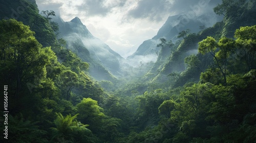 Lush green forest canopy covers the scene complemented by misty mountains appearing softly in the background