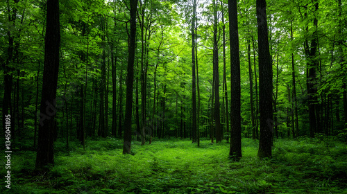 Lush Green Forest Interior With Sunlight Penetrating The Dense Canopy Creating A Scenic Woodland Landscape With Shadows