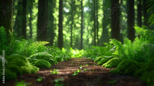 Lush Green Forest Path with Ferns and Sunlight in Scenic Nature