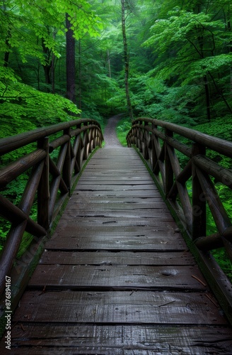 Lush green forest path with wooden bridge