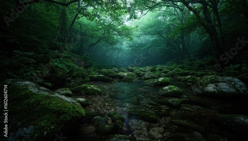 Lush, green forest scene featuring a clear stream flowing over moss-covered rocks. Dense foliage creates a dark, moody atmosphere with hazy sunlight filtering through the trees