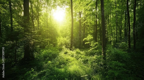 Lush green forest scene with diverse trees and vibrant underbrush illuminated by bright sunlight filtering through the foliage