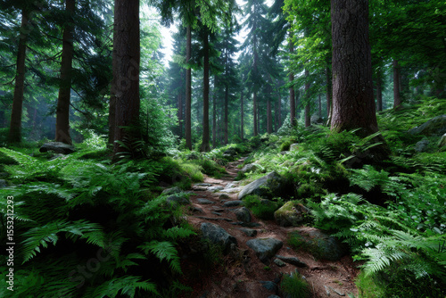 Lush green forest trail under sunlight with stones and ferns along the pathway