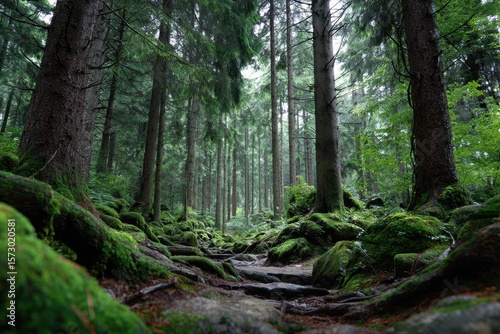 Lush green forest trail with moss-covered rocks and tall trees on a misty day