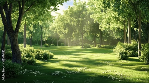 Lush green forest with sunlight filtering through trees, vibrant foliage, serene atmosphere