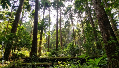 Lush Green Forest with Tall Trees and Sunlight Filtering Through Leaves