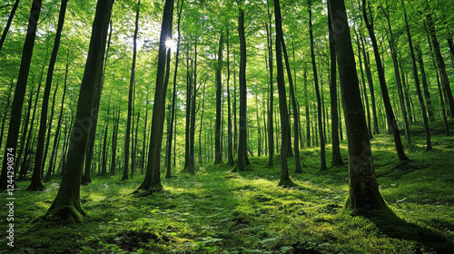 Lush green forest with tall trees and sunlight filtering through the leaves.