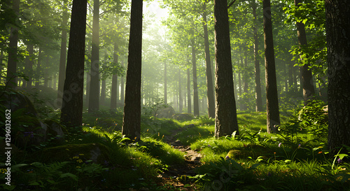 lush green forest with tall trees sunlight filtering through leaves peaceful woodland environment