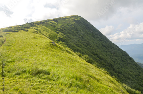 Lush green hillside with a serene slope under a clear sky lightly adorned with clouds, capturing the tranquility and beauty of a natural landscape. Carpathian Mountains, Ukraine