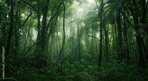 Lush Green Jungle Forest with Dense Foliage in Sunlight Tropical Rainforest Scene with Abundant Vegetation and Natural Scenery