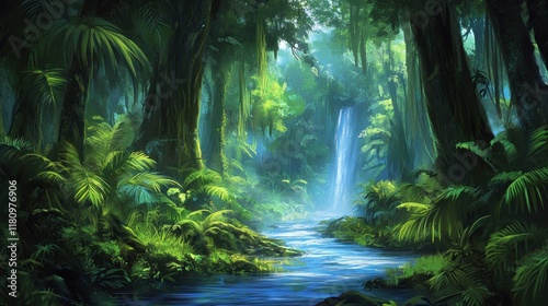 Lush green jungle scene with a waterfall and stream.