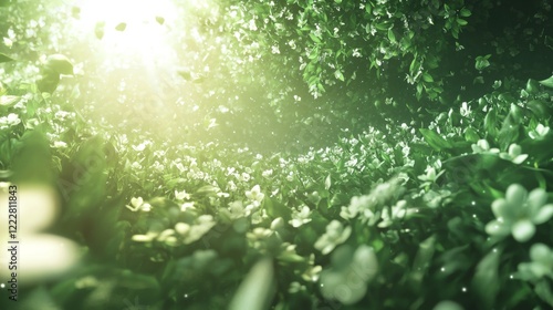 Lush Green Landscape with Sunlight Filtering Through Leaves and Flowers in a Serene Natural Setting