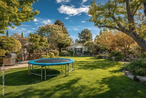 Lush green lawn with trampoline in backyard of suburban home, featuring trees, grill, and clear blue sky