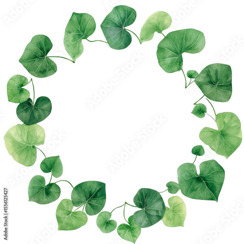 Lush green leaves arranged circular pattern, creating natural frame. This design evokes sense