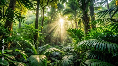 Lush green leaves bask in sunlight, creating a vibrant tropical jungle atmosphere, where golden rays filter through dense foliage, igniting nature's serene beauty.
