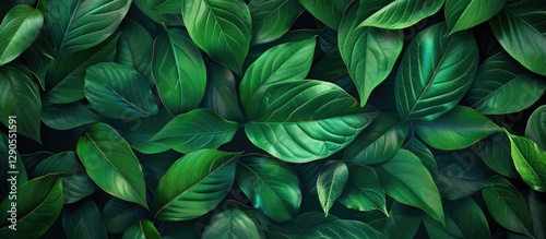 Lush green leaves in a dense arrangement against a dark background featuring various shades of deep green ideal for nature-themed projects
