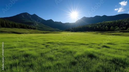 Lush green meadow stretches towards towering mountains under a vibrant blue sky, bathed in the warm light of a setting sun