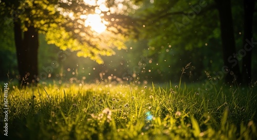 Lush green meadow with sunlight filtering through trees, creating a serene and natural environment