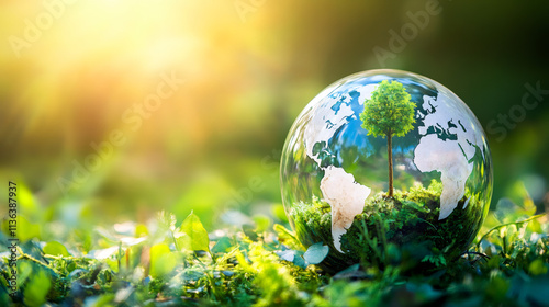 Lush green moss and a single tree growing inside a crystal ball with a world map superimposed on it evoke environmental awareness