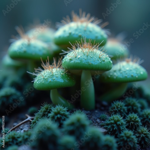 Lush green mushrooms emerge from the forest floor, adorned with dew drops, creating a magical and serene atmosphere ideal for nature enthusiasts and botanical themes.