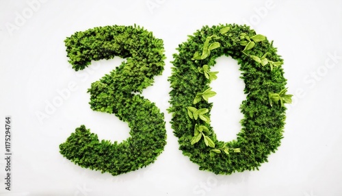 Lush Green Number Thirty 30 Made from Fresh Leaves Symbolizing Sustainability, Nature Inspired Design, and Eco Friendly Concepts in Visual Art