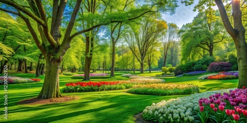 Lush green park with blooming flowers and tall trees surrounded by a serene atmosphere, garden